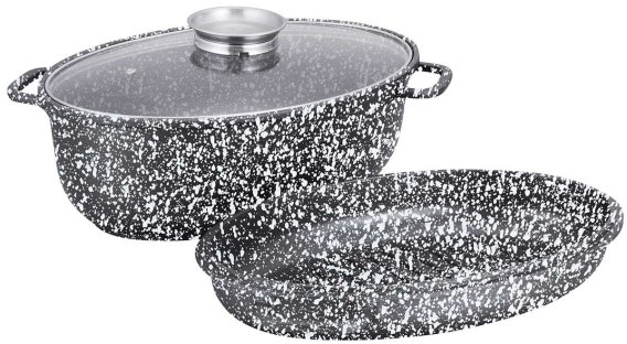 Brytfanna z pokrywą oraz brytfanną grillową pokryta ceramiczną marmurową powłoką nieprzywierającą. Naczynia wykonane ze stopu aluminium posiadają indukcyjne ferromagnetyczne dno. Są przystosowane do współpracy z każdym rodzajem kuchni, także płytami indukcyjnymi. Naczynie w komplecie posiada żaroodporną pokrywę z aromatyzerem, dzięki której możemy uzupełnimy płyny w przygotowywanej potrawie bez ściągania pokrywy co pozwoli nam nie utracić tak niezbędnych w pożywieniu witamin i nada potrawie wspaniały smak.