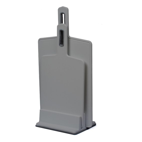 Zestaw desek do krojenia zawiera 2 rozmiary desek VEGANA wraz ze stojakiem. Komplet kuchenny idealnie będzie pasował do twojej kuchni. Deski charakteryzują się prostym, minimalistycznym, nowoczesnym designem, a dodatkowo posiadają antypoślizgowe gumki utrzymujące dodające im niepowtarzalnego wyglądu i utrzymujące je w jednej pozycji podczas pracy na nich. Kolor szary będzie pasował praktycznie do każdego rodzaju kuchni.