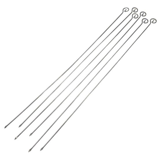 Zestaw 6 szt. stalowych szpikulców do przygotowania różnego rodzaju szaszłyków. Szpilki wykonane z grubego drutu ze spłaszczonymi końcówkami co zapobiega zsuwaniu się mięsa czy warzyw podczas obracania czy zdejmowania szaszłyków z grilla.