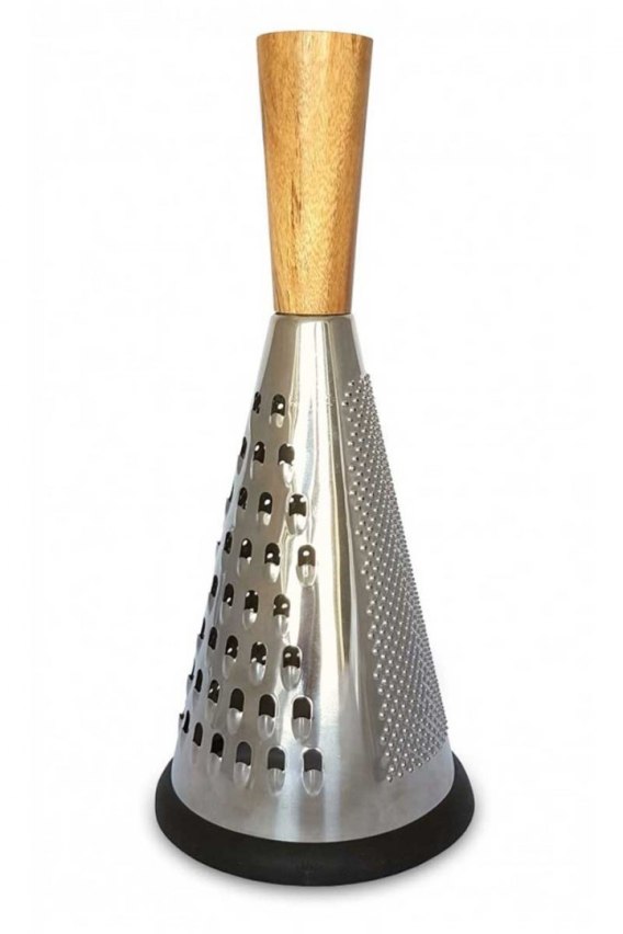 Stalowa tarka z uchwytem z drewna akacjowego oraz antypoślizgową podstawą.