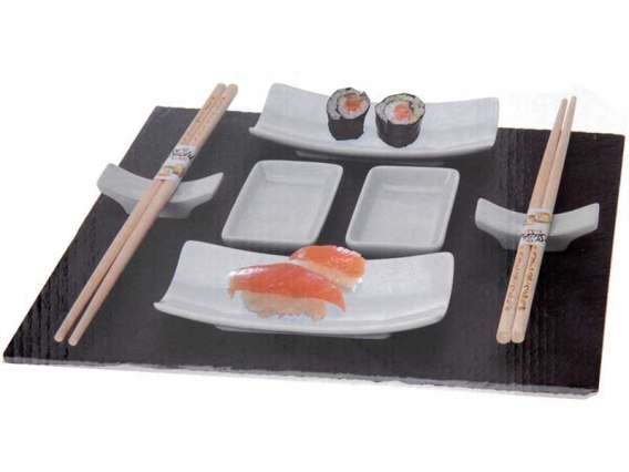 Oryginalny zestaw do serwowania przekąsek na kamiennej podstawie z kamienia łupkowego. Sprawdzi się do podawania sushi a także słonych przystawek. Komplet z pewnością znajdzie zastosowanie podczas spotkań rodzinnych i towarzyskich. W zestawie 2 porcelanowe miseczki, 2 podstawki oraz drewniane pałeczki i bambusowe maty. Produkt sprawdzi się ponadto również jako oryginalny pomysł na prezent.