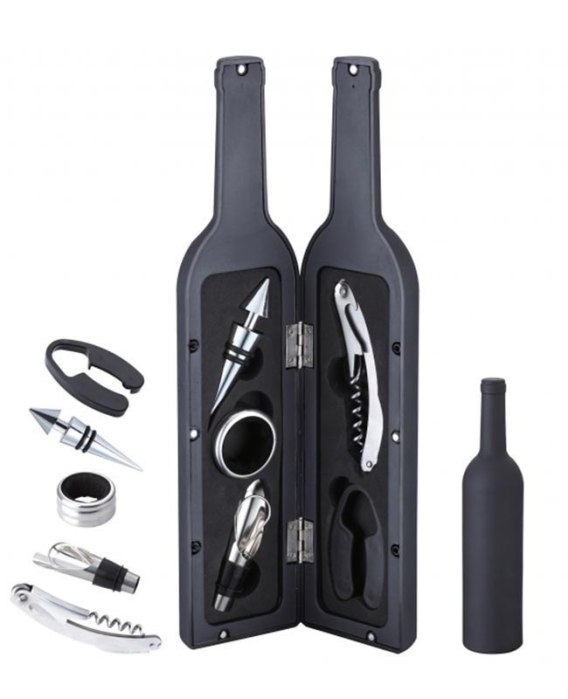 Zestaw przyborów do wina w etui w formie rozkładanej butelki.