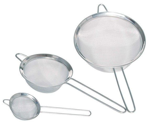Zestaw sitek kuchennych wykonanych ze stali nierdzewnej. Przydatne do mąki, cukru pudru czy przecedzania wywarów.